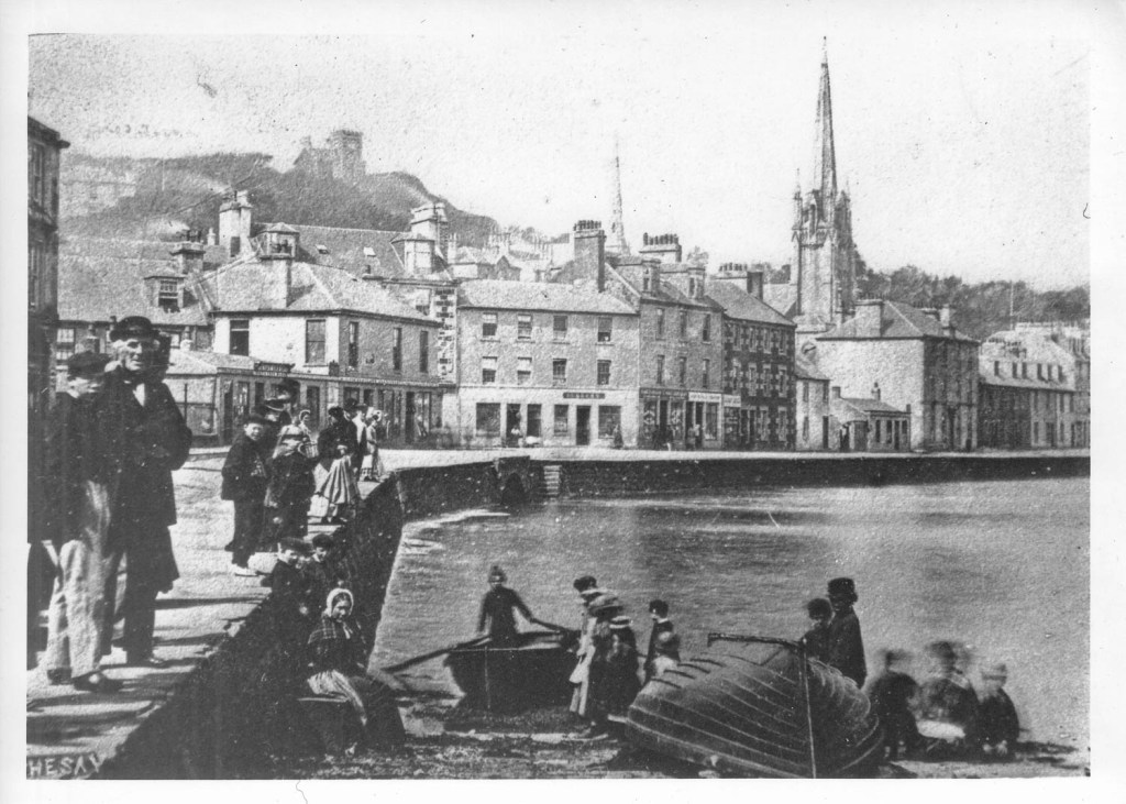 Above is an early photograph of Victoria Street taken some time before 1869 prior the land to the seaward side being reclaimed to provide the land for the Esplanade and gardens. The funding was provided by George Stevenson, of Glen Caladh, (£500), the Marquis of Bute (£700) and public subscription of £700. The new Esplanade was opened in 1872. Was the Thomson Grocers somewhere in this picture?