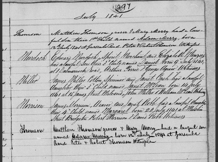 When the 1841 census was taken, the family was living in Grove St, Glasgow. My great-grandfather Adam Merry Thomson was born after the census was taken, in Garscube Rd, Glasgow, on 12 July 1841.