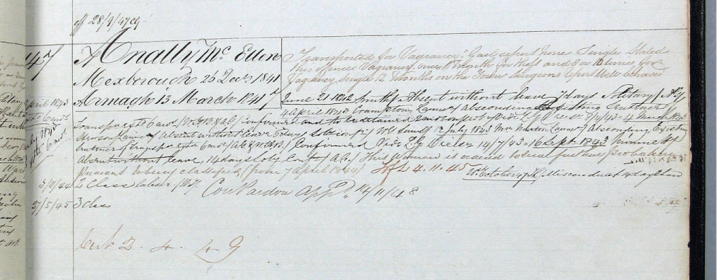 Ellen was transported for vagrancy. Gaol report none. Single. Stated this offence Vagrancy) once 6 months for theft and 8 or 10 lines for Vagrancy, Single 12 months on the Town Surgeons ReportWell Behaved.