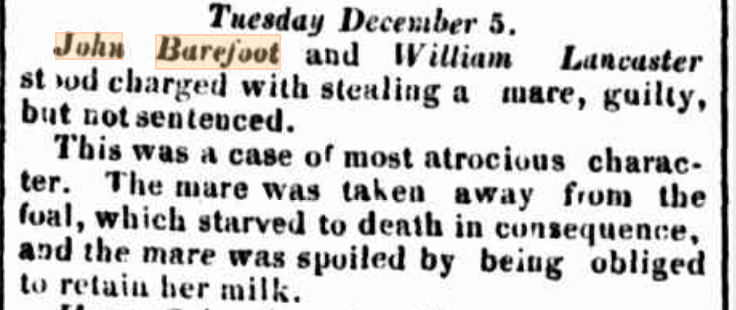 Unfortunately in 1837, John, along with William Lancaster, was charged with stealing a mare.